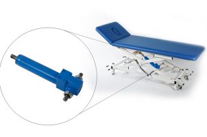 | 診察台の高さ調整に使用されています。 油圧手動式のため電気の供給が無い場所で使用できます。 消毒液、洗剤、腐食に対して耐性を備えていますので医療現場にも最適です。 |