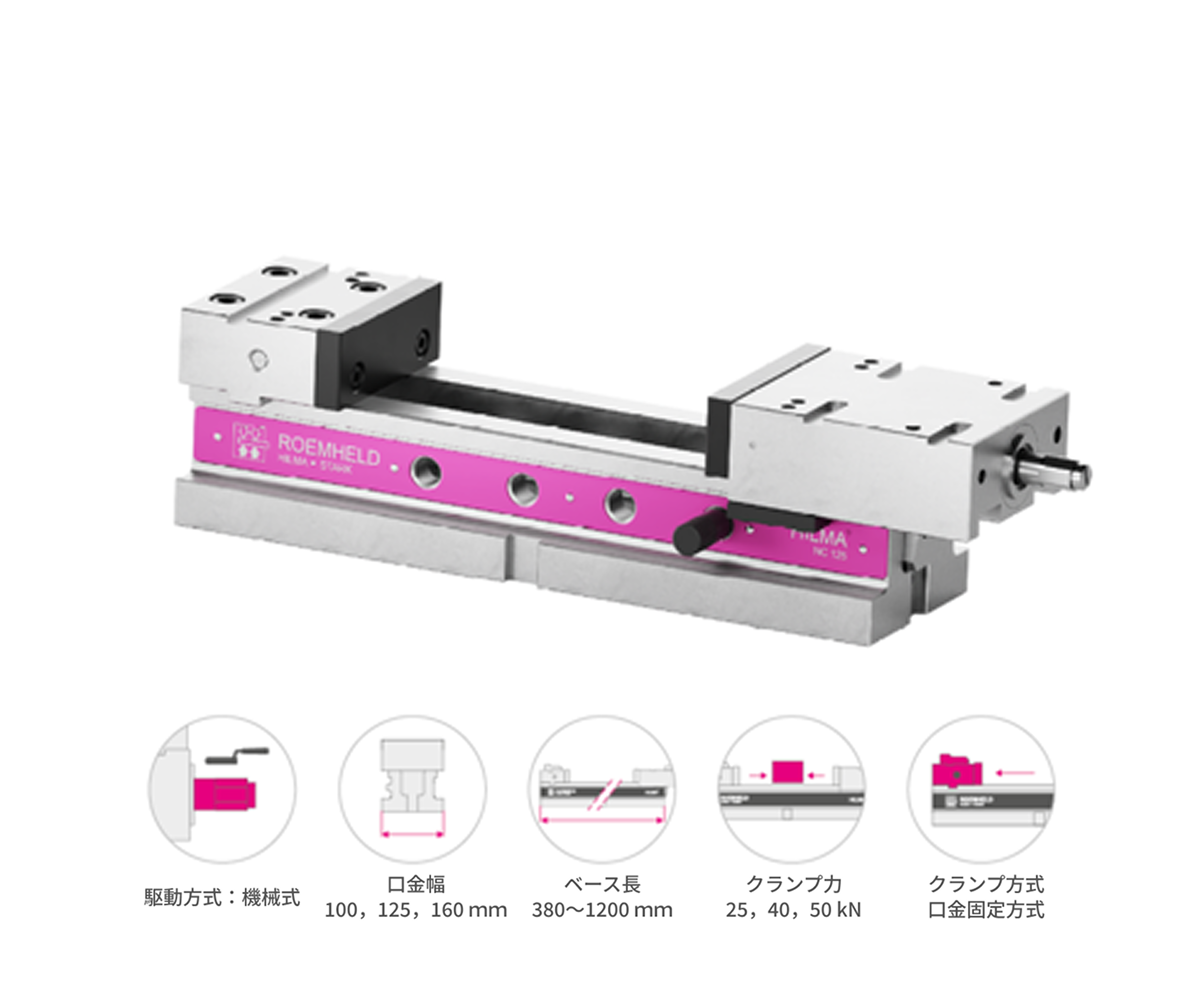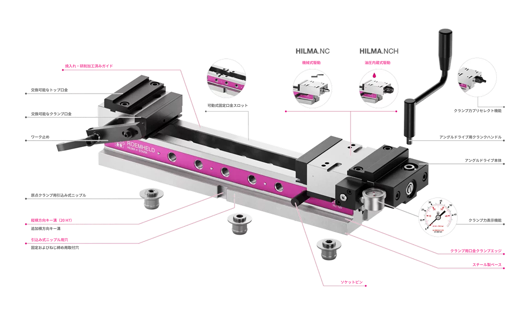加工方法や自動化のレベルに応じて、ハンドルによる手動クランプ(HILMA.NC)または、内蔵式の油圧クランプ(HILMA.NCH)のいずれかを選択可能