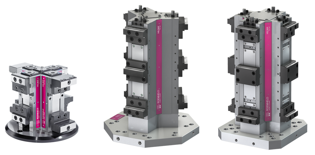 マシンバイスで高度な技術を持つロームヘルドグループ(Roemheld)のヒルマ(HILMA)が開発したタワー型バイスは横形の加工機向けに最適設計されていますが、無人化システムへ組み込まれた実績や、5軸加工機への採用実績もあります。テーブル回転時のワークと機械の干渉をさけるため、4面タイプの他、3面タイプもラインナップしております。